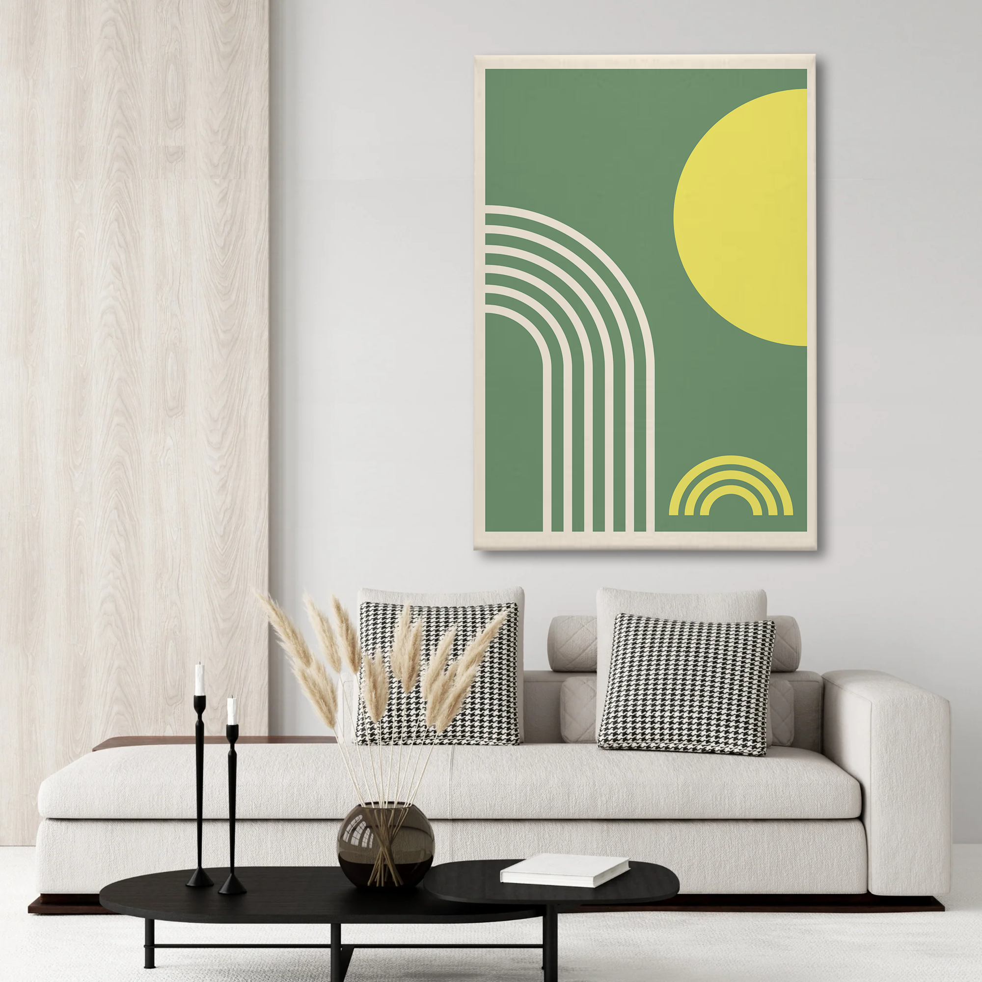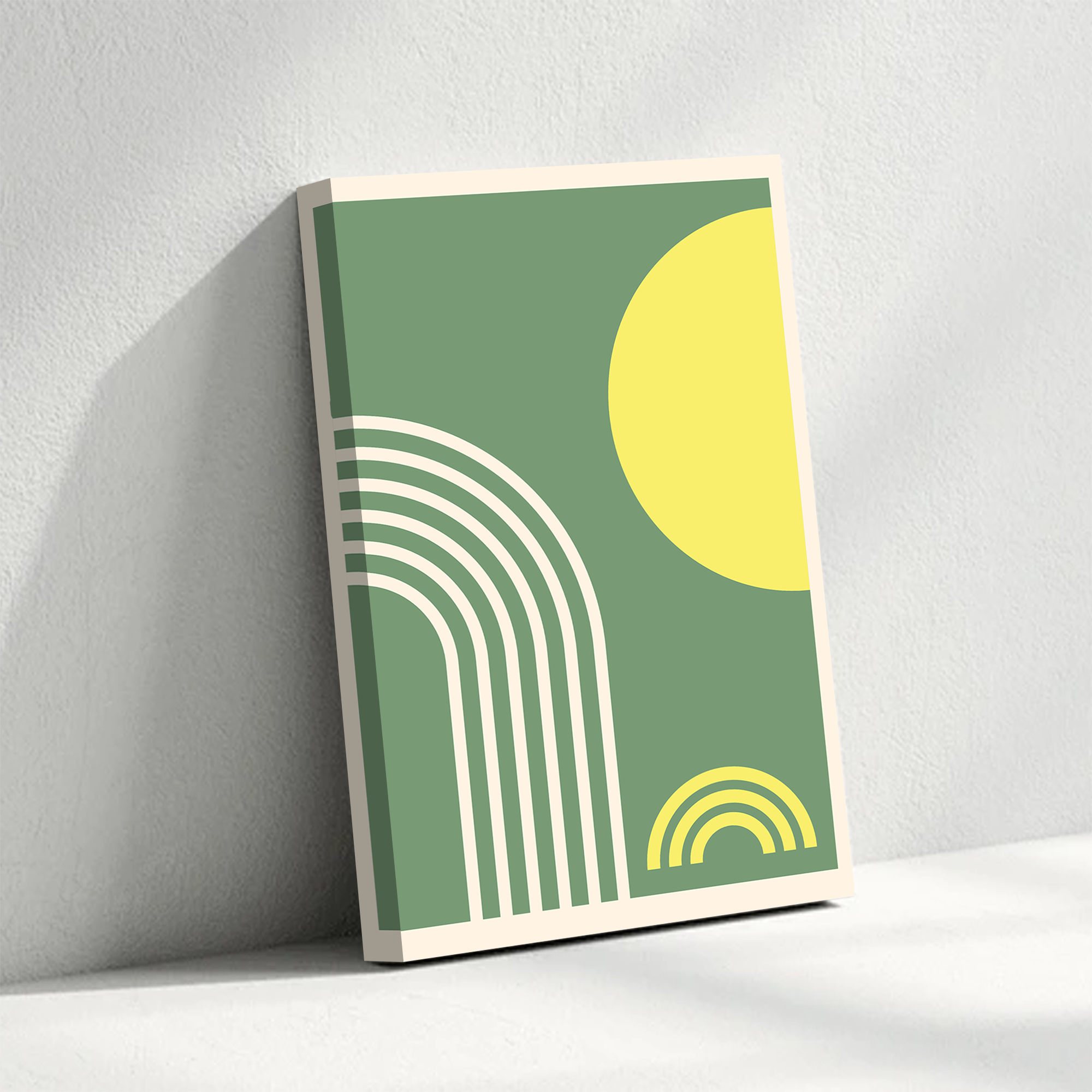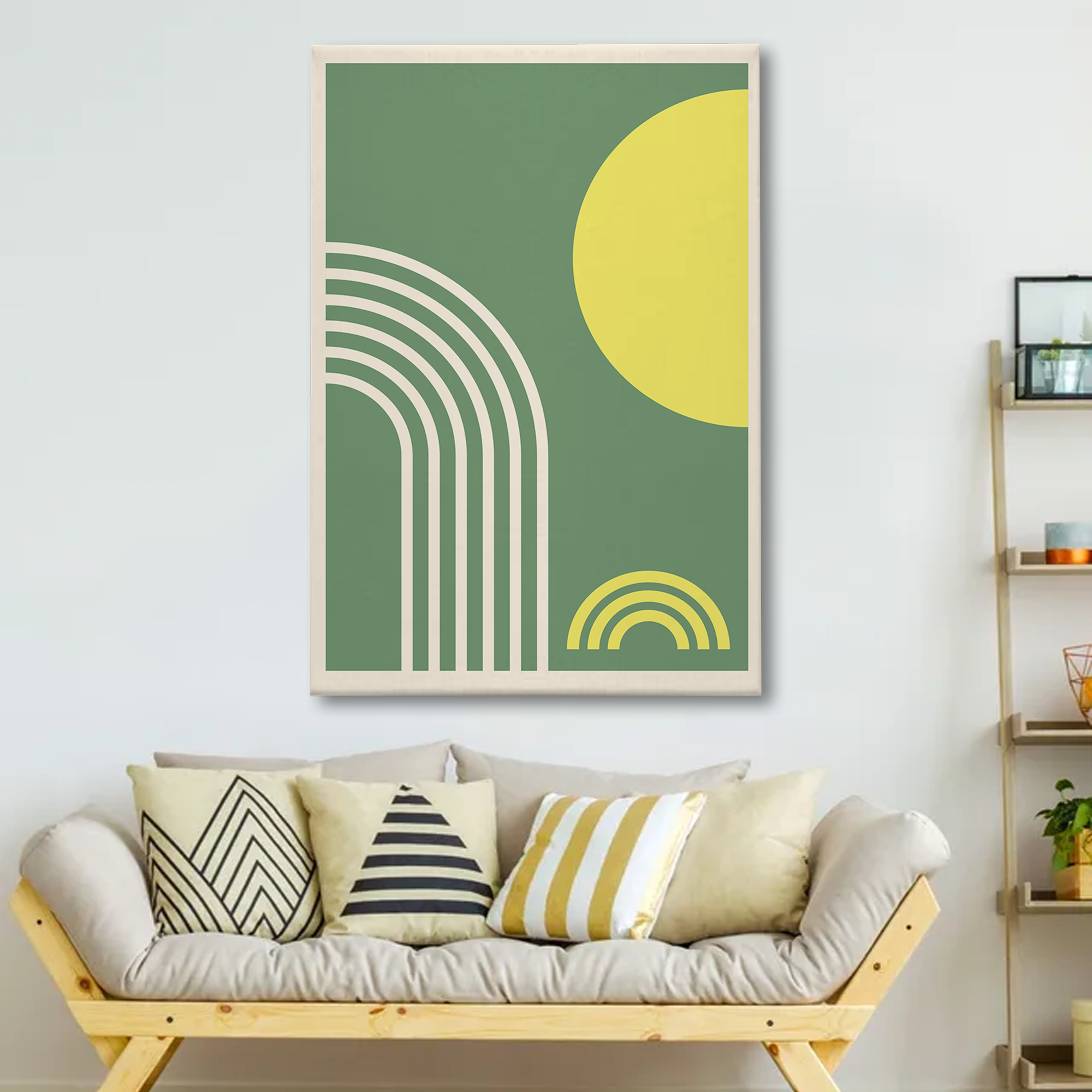 Boho Rainbow Geometric Canvas Wall Art – Modern Minimalist Decor in Green & Yellow