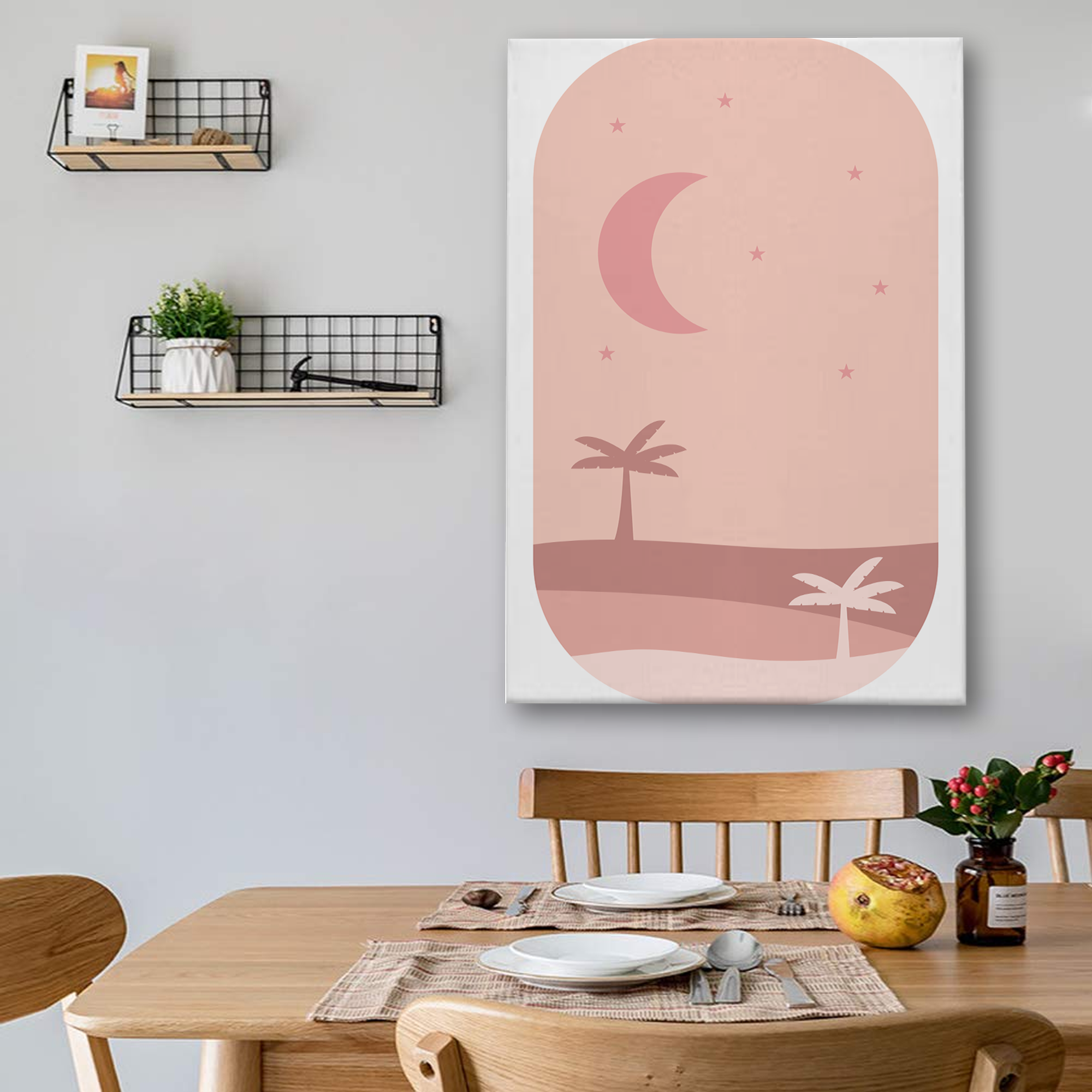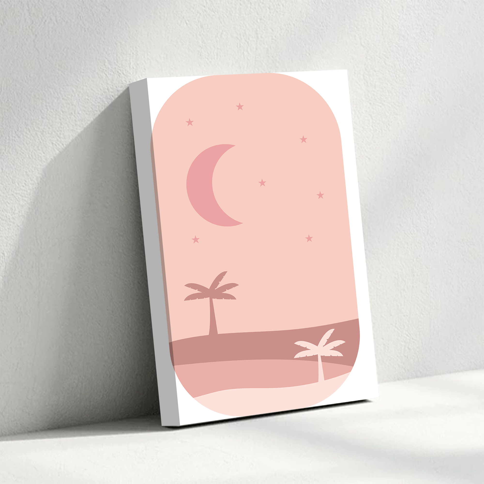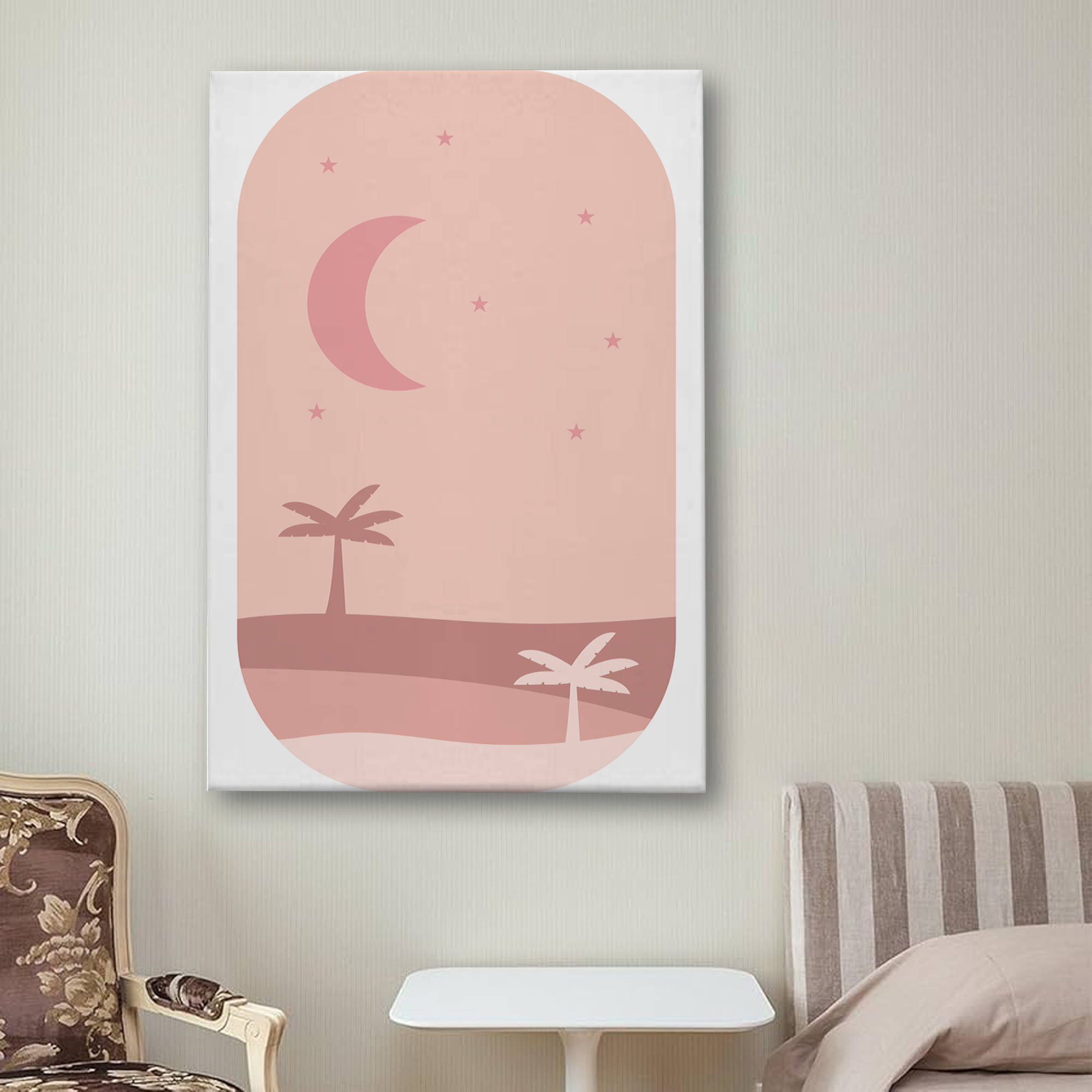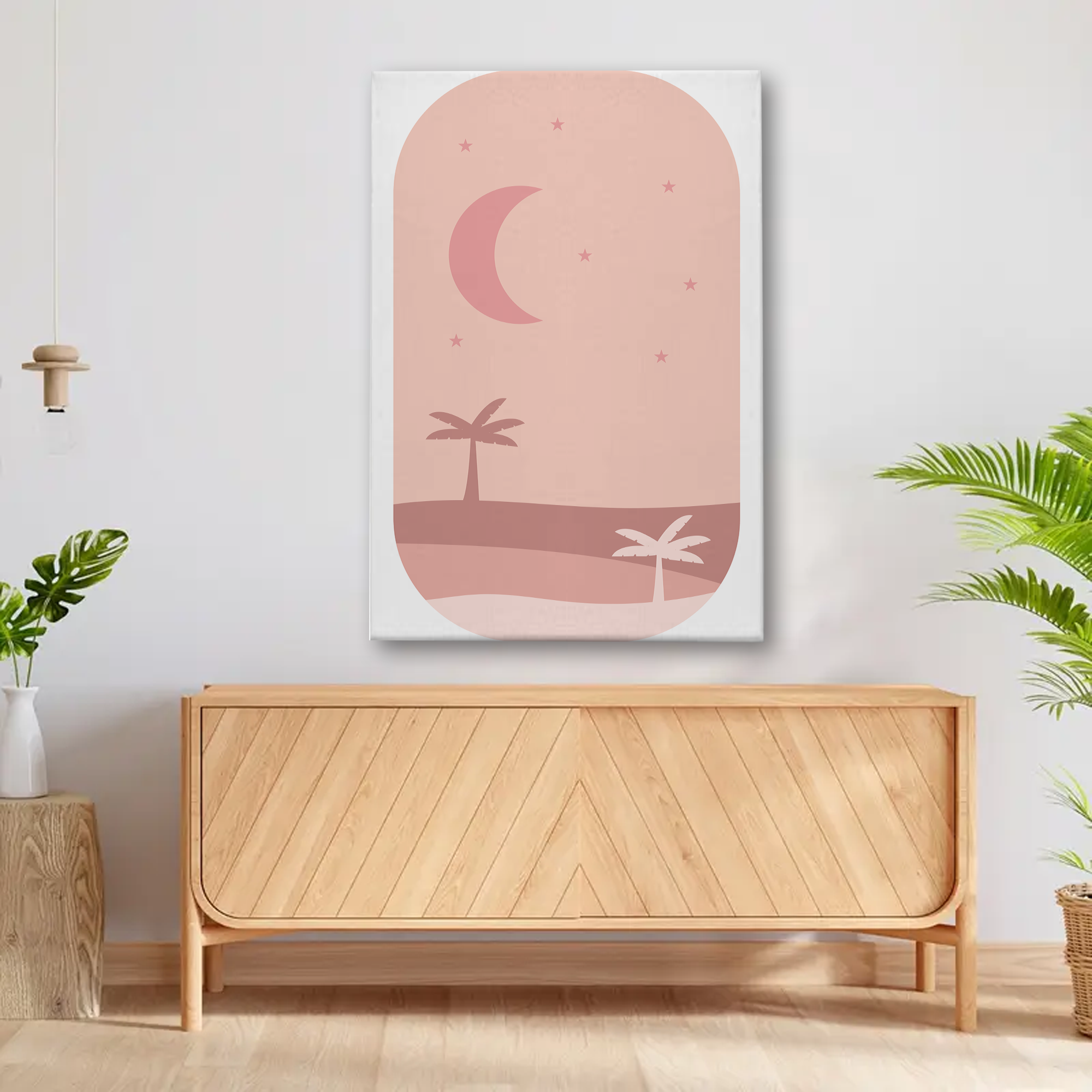 Minimalist Moon & Palm Trees Wall Art – Soft Pink Canvas Print